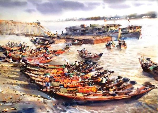 缅甸画家Thein Shwe Kyi获得金牌奖的作品是以阿仰(A-yan)缅甸中部地区收割农作物的一群农妇们为背景,她们在工作后休息聚餐时的这一幅水彩画,突出表露出了缅甸乡村的社会风貌。同样的,另一位画家Myint Naing的作品也是以仰光码头为背景,详细描绘出了码头的风貌景色。有关作者及作品的详细情况可进入www.facebook. Myint Naing账号中观看。