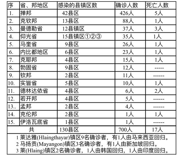 缅甸卫生部于11月16日下午4时发布公告,全国各省邦11月15日的确诊人数共为700人,死亡人数17人,具体数据如下表: