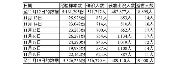 缅甸卫生部11月13日至11月19日每晚8时时所公布的疫情情况分别如下: