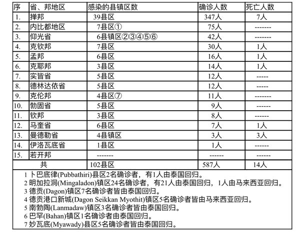 缅甸卫生部于11月19日下午4时发布公告,全国各省邦11月18日的确诊人数共为587人,死亡人数14人,具体数据如下表: