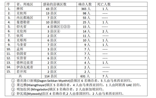 缅甸卫生部于11月24日下午4时发布公告,全国各省邦11月23日的确诊人数共为631人,死亡人数7人,具体数据如下表: