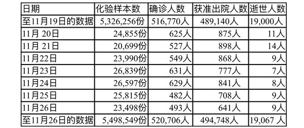 缅甸卫生部11月20日至11月26日每晚8时时所公布的疫情情况分别如下: