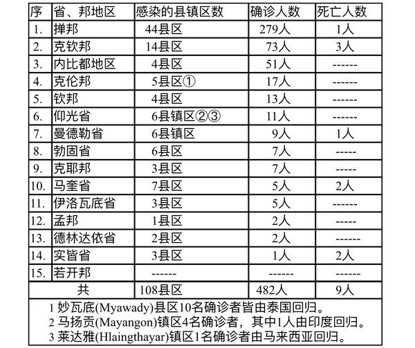 缅甸卫生部于11月26日下午4时发布公告,全国各省邦11月25日的确诊人数共为482人,死亡人数9人,具体数据如下表: