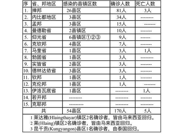 缅甸卫生部于12月19日下午4时发布公告,全国各省邦12月18日的确诊人数共为170人,死亡人数5人,具体数据如下表: