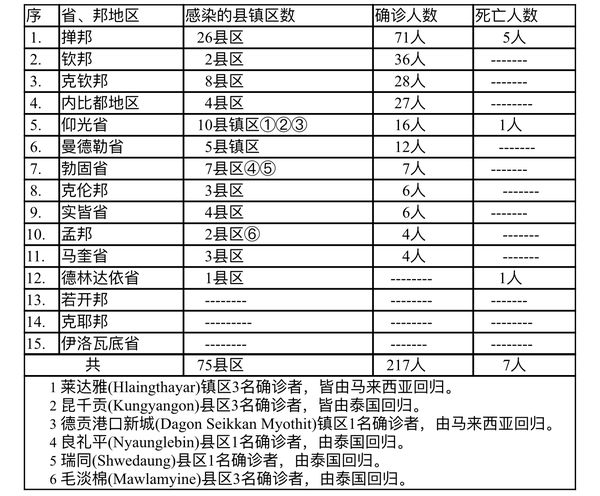 缅甸卫生部于12月18日下午4时发布公告,全国各省邦12月17日的确诊人数共为217人,死亡人数7人,具体数据如下表: