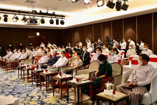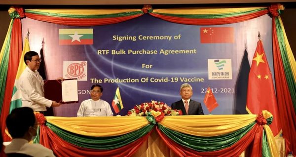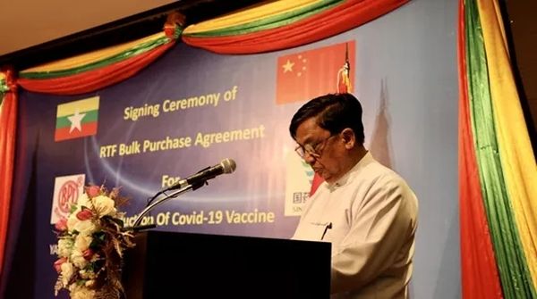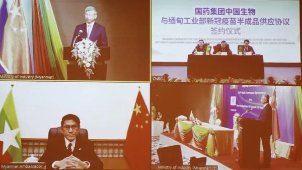 12月22日,国药集团中国生物与缅甸工业部举行新冠疫苗半成品供应协议签署仪式。中国驻缅甸大使陈海、缅甸工业部部长查理丹、卫生部部长岱楷温、仰光省政府首席部长腊梭、缅甸驻华大使苗丹佩、国药集团董事长刘敬桢、国药集团总工程师兼中国生物董事长杨晓明、中国驻缅甸使馆公参李小艳等分别在仰光、北京两地出席签约仪式。