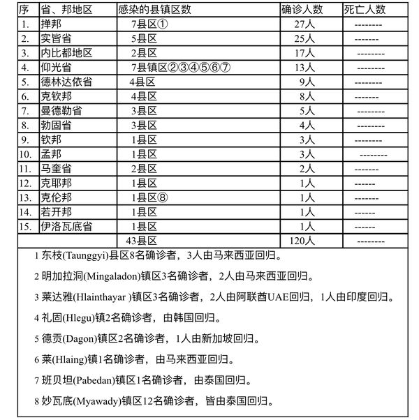 缅甸卫生部于1月27日下午4时发布公告,全国各省邦1月26日的确诊人数共为120人,无死亡人数,具体数据如下表: