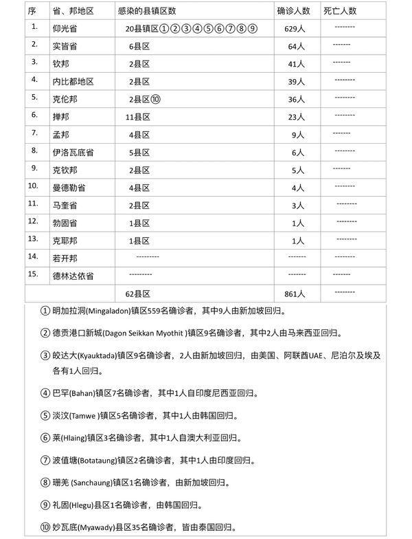 缅甸卫生部于2月2日下午4时发布公告,全国各省邦2月1日的确诊人数共为861人,无死亡人数,具体数据如下表: