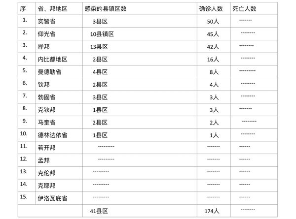 缅甸卫生部于1月31日下午4时发布公告,全国各省邦1月30日的确诊人数共为174人,无死亡人数,具体数据如下表: