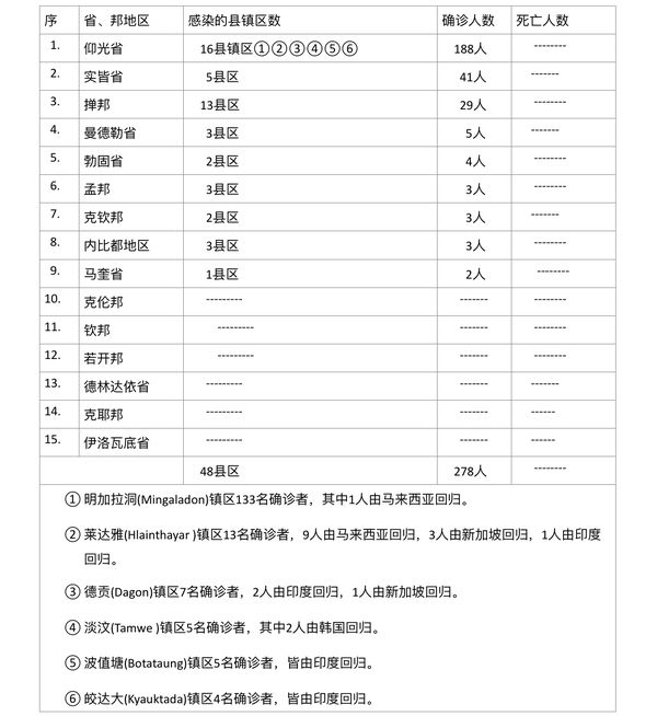 缅甸卫生部于2月1日下午4时发布公告,全国各省邦1月31日的确诊人数共为278人,无死亡人数,具体数据如下表: