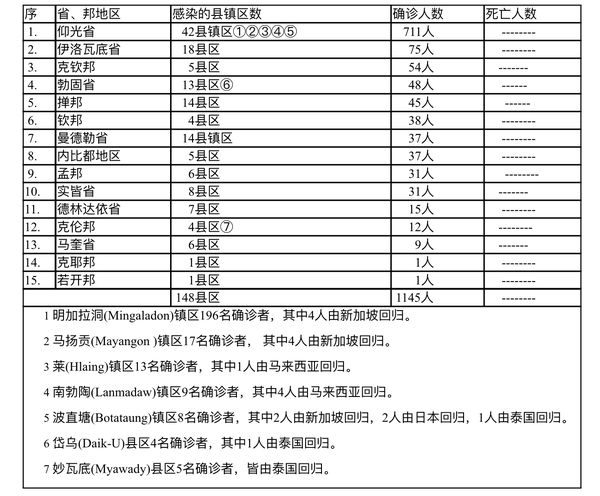 位居第四的是勃固省,确诊者皆为48人,其中达耶瓦底(Tharrawaddy)县区确诊者12人,首府勃固(Bago)县及克瓦(Kawa)县区各6人。位居第五的是掸邦,确诊人数45人,14个县区中,彬德雅(Pindaya)县区确诊者13人,林奎(Langkho)县区10人。接下来第六位钦邦确诊人数为38人,其中铁定(Tiddim)县区确诊者达到32人。位居第七的为曼德勒省及内比都地区,确诊人数皆为37人,曼德勒省内昂迈达赞(Aungmyay Thazar)镇区确诊人数11人,内比都地区扎慕底律(Zamuthiri)县区确诊人数21人,都是不可小觑。接下来孟邦及实皆省确诊者皆为31人,孟邦中丹彪扎耶(Thanbyuzayat)县区确诊者9人,吉马鲁(Kyaukmaraw)县区8人,穆洞(Mudon)7人。实皆省克礼(Kalay)县区确诊者19人。德林达依省确诊者15人,其中朗弄(Launglone)县区及德林达依县区各5人。克伦邦确诊者12人,其中妙瓦底县区确诊者5人皆为由泰国回归者。马奎省确诊者9人,最后克耶邦及若开邦确诊者各为1人。