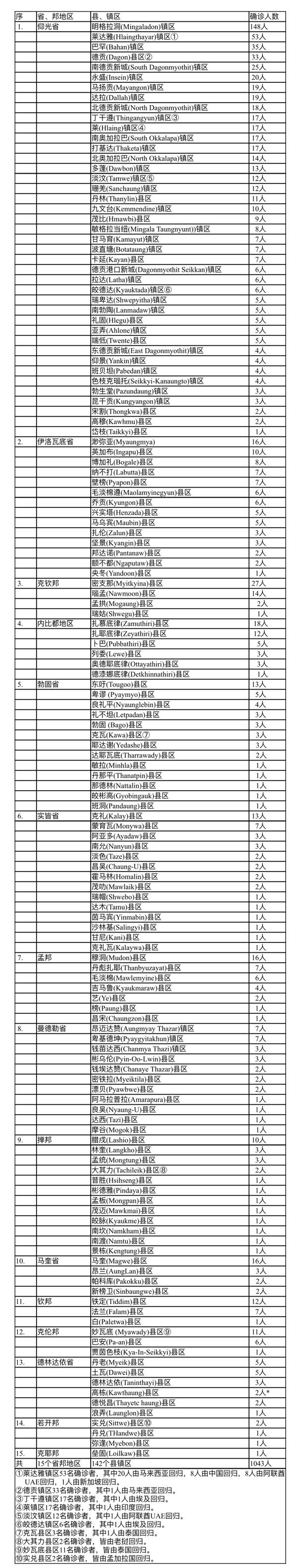 缅甸卫生部于2月10日下午5时发布公告,全国各省邦2月9日的确诊人数共为1043人,无死亡人数,具体数据如下表:
