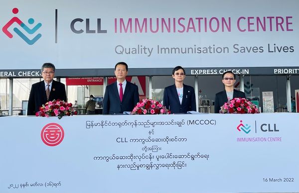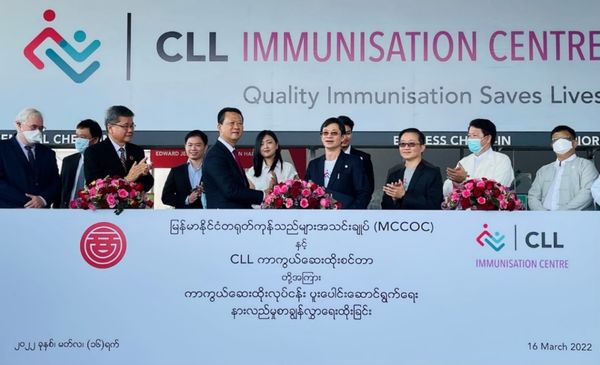 2022年3月16日上午9时,缅甸中华总商会与CLL免疫中心在仰光丁眼尊镇的Sealion公司下属CLL免疫中心隆重举行签约仪式,双方正式签署谅解备忘录(MoU), 就进口第二批中国国药疫苗为年满12周岁以上人群接种服务开展合作达成协议。