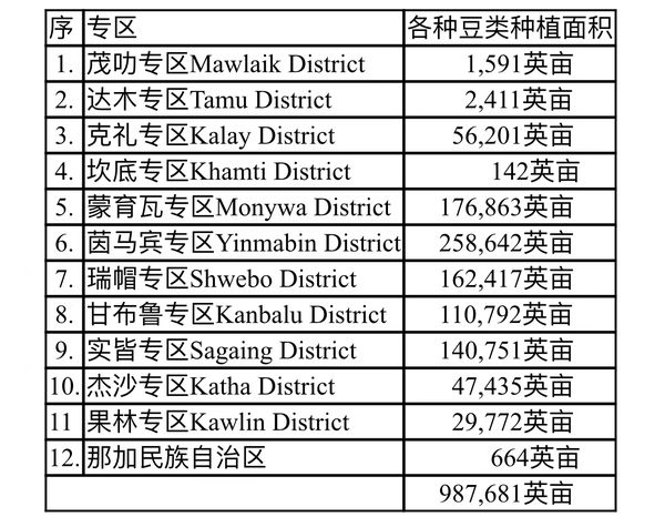实皆省内11个专区及那加民族自治区在本财政年度(2021—22)内种植的芝麻面积如下: