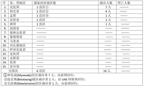 缅甸卫生部于5月19日下午4时发布公告,全国各省邦,5月18日的确诊人数共14人,无死亡人数,具体数据如下表: