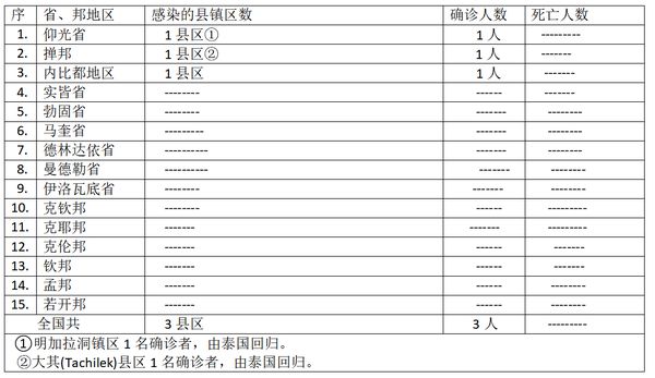 缅甸卫生部于5月23日下午4时发布公告,全国各省邦,5月22日的确诊人数共3人,无死亡人数,具体数据如下表: