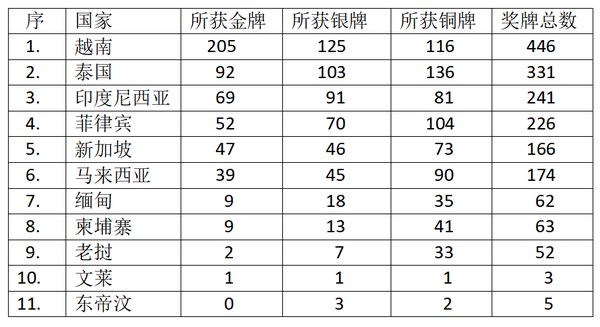 第31届东南亚运动会各国所获得的奖牌如下表: