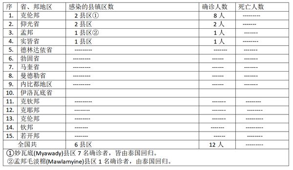缅甸卫生部于6月2日下午4时发布公告,全国各省邦,6月1日的确诊人数共12人,无死亡人数,具体数据如下表: