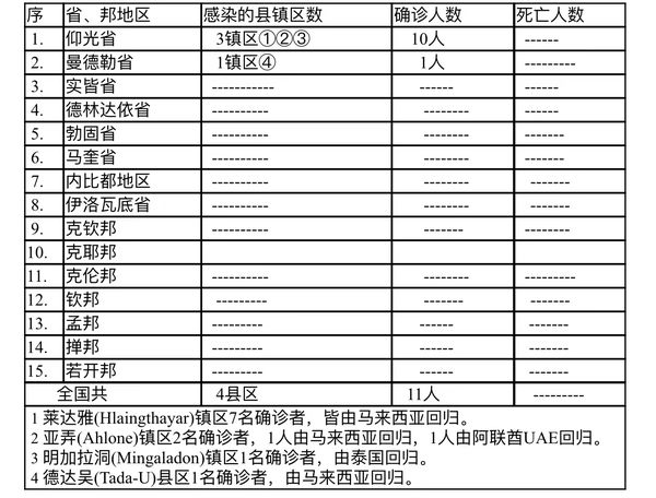 缅甸卫生部于6月24日下午4时发布公告,全国各省邦,6月23日的确诊人数11人,无死亡人数,具体数据如下表: