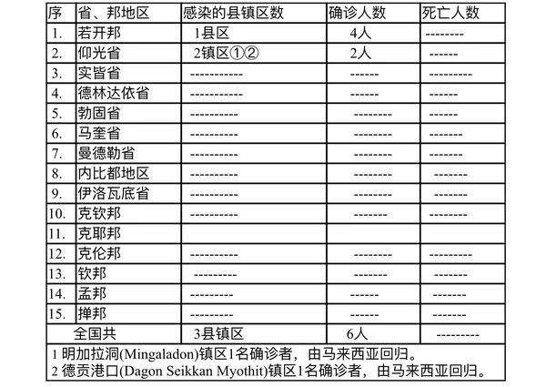 缅甸卫生部于6月25日下午4时发布公告,全国各省邦,6月24日的确诊人数6人,无死亡人数,具体数据如下表: