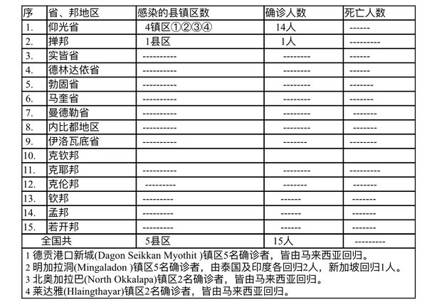 缅甸卫生部于6月26日下午4时发布公告,全国各省邦,6月25日的确诊人数15人,无死亡人数,具体数据如下表: