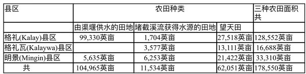格礼专区在种植雨季作物时,由渠堰等水利工程获得水源的田地有104,965英亩,利用堵、截各溪流方法获得水源的田地有11,534英亩,望天田有62,051英亩,准备种植雨季作物的农田共有178,550英亩。