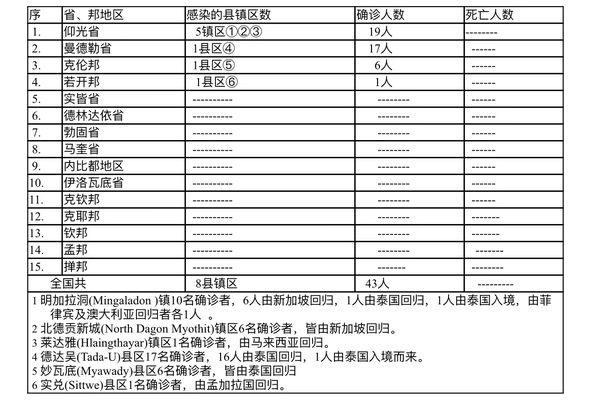 缅甸卫生部于7月24下午4时发布公告,全国各省邦,7月23日的确诊人数43人,无死亡人数,具体数据如下表: