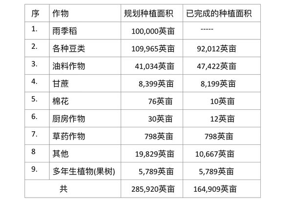 而今年钦乌县区规划种植的雨季作物为:雨季稻10万英亩,豆类109,965英亩,油料作物41,034英亩,甘蔗8,399英亩,棉花76英亩,厨房作物30英亩,草药作物798英亩,其他作物19,829英亩,多年生植物5,789英亩,共规划种植285,920英亩。