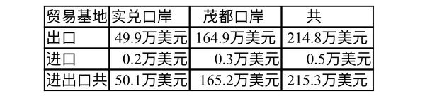 实兑贸易基地中,由Shwemingan码头出口49.9万美元的物资,进口2千美元的货物。而茂都贸易基地中,由Kanyin Chaung经济区出口的物资总值达到164.9万美元,进口物资为3千美元。这两个边境贸易基地这7月份的进出口贸易额如下表: