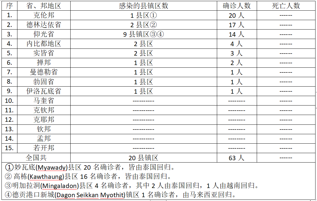 8月23日这一天缅甸全国确诊人数增加到63人,确诊人员皆来自克伦邦、德林达依省、仰光省、内比都地区、实皆省、掸邦、曼德勒省、勃固省及伊洛瓦底省9个省邦地区。