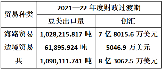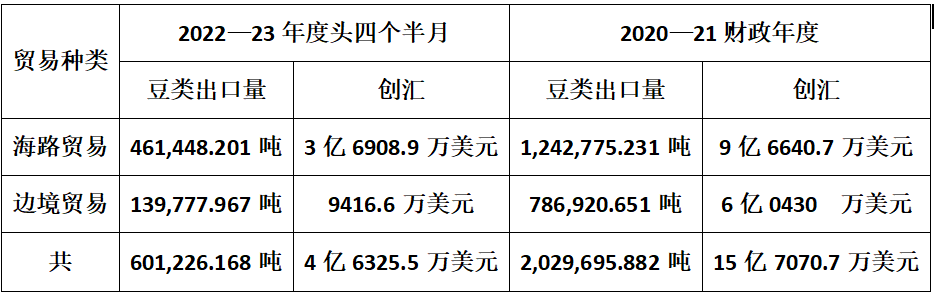 在2021—22财政年度过渡期,由2021年10月1日至2022年3月31日为止这6个月期间,由海路贸易出口豆类1,-028,215.817吨,创汇7亿8015.6万美元。由边贸出口豆类61,895.924吨,创汇5046.9万美元。故在此财政过渡期豆类出口共为1,090,111.741吨,创汇共为8亿3062.5万美元。