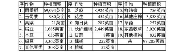 本漂县区在现2022—23财政年度雨季作物种植季节时除种植雨季稻69,000多英亩之外,还种植了玉米、各种豆类、油料作物(包括芝麻、花生及向日葵)、工业原料作物棉花、甘蔗等等。所种植的各种作物面积如下表: