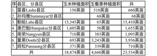 各县区、分县区所种植的玉米及玉蜀黍的面积如下表: