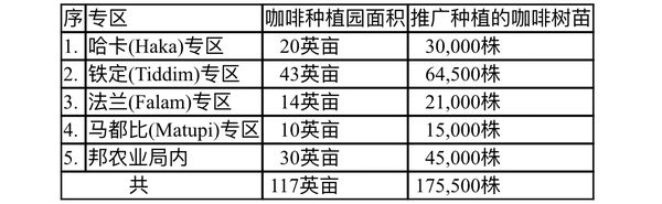 钦邦的这四个专区内规划推广种植的咖啡园面积及树苗数如下: