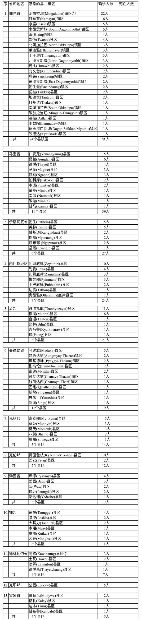 10月2日这天确诊人员来自全国13个省邦地区,仅钦邦及若开邦为零确诊地区了。
