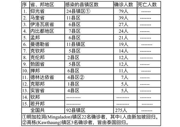 确诊者275人,来自13个省邦地区的92个县镇区。确诊者中由国外回归者为4人(由泰国回归者3人,由新加坡回归者1人),国内确诊人员271人。这271名国内确诊人员中,仰光省占了78人(不到30%的比例),各省邦的确诊人员都已是仰光省确诊人数的2倍多了。剩下全缅各省邦193名国内确诊者中,马奎省39人,伊洛瓦底省27人,内比都24人,孟邦21人,曼德勒省19人,克钦邦确诊者为14人,克伦邦及勃固省各12人,掸邦11人,克耶邦及实皆省各5人,德林达依国内确诊者4人。感染人员遍布全国各省邦地区。