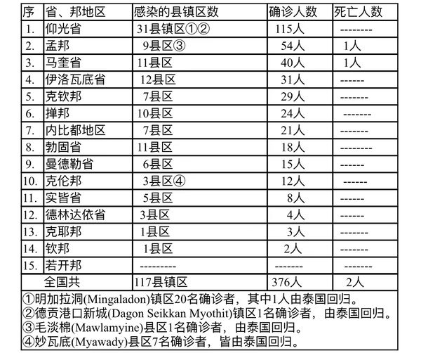 确诊者376人,来自14个省邦地区的117个县镇区。另外有2人因新冠疫情而死亡,分别是来自孟邦穆洞县区1人及马奎省敏巫县区1人。确诊者中由国外回归者为10人(皆由泰国回归者),国内确诊人员366人。这366名国内确诊人员中,仰光省占了113人(差不多是 30% 的比例),各省邦的确诊人员是仰光省确诊人数的2倍多了。剩下全缅各省邦253名国内确诊者中,孟邦国内确诊者53人,马奎省40人,伊洛瓦底省31人,克钦邦29人,掸邦24人,内比都21人,勃固省18人,曼德勒省15人,实皆省8人,克伦邦国内确诊者5人,德林达依省4人,克耶邦3人,钦邦2人。感染人员遍布全国各省邦地区。
