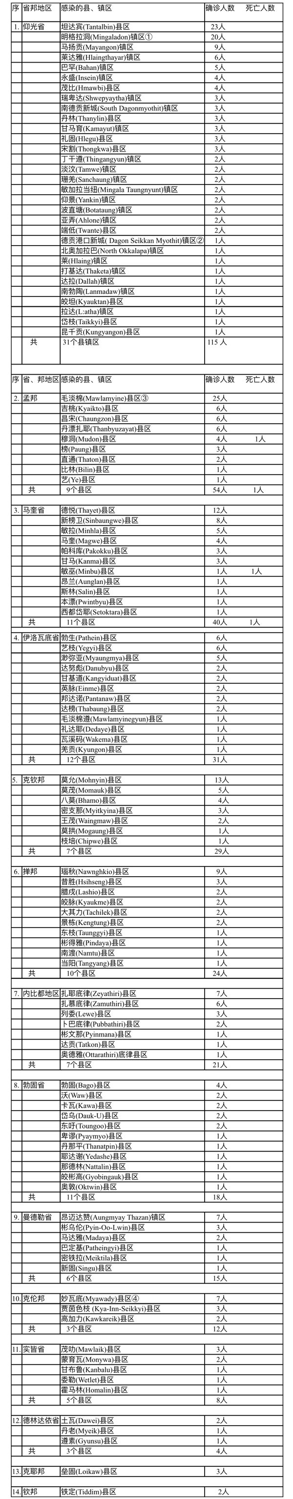 缅甸卫生部于10月8日下午4时发布公告,全国各省邦,10月7日的确诊人数376人,死亡人数2人,具体数据如下表: