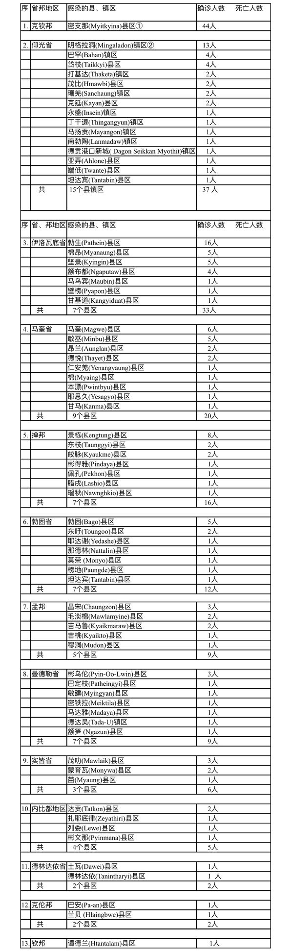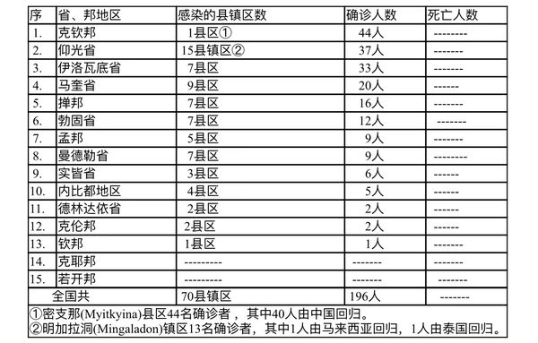 确诊者196人,来自13个省邦地区的70个县镇区。确诊者中由国外回归者为42人(40人由中国回归,1人由泰国回归者,1人由马来西亚回归),国内确诊人员154人。这154名国内确诊人员中,仰光省只占35人(都不到 四分之一 的比例),各省邦的确诊人员是仰光省确诊人数的3倍多了。剩下全缅各省邦119名国内确诊者中,伊洛瓦底省33人,马奎省20人,掸邦16人,勃固省12人,孟邦及曼德勒省各9人,实皆省6人,内比都5人,克钦邦国内确诊者4人,克伦邦及德林达依省各2人,钦邦1人。感染人员遍布全国各省邦地区,一个特殊情况就是克钦邦密支那县区一举 出现44名确诊者,其中40人是由中国回归人员,这个情况不容小觑。