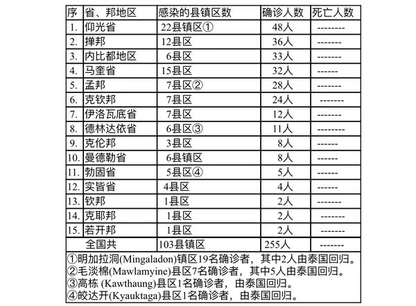 缅甸卫生部于10月17日下午4时发布公告,全国各省邦,10月16日的确诊人数255人,无死亡人数,具体数据如下表: