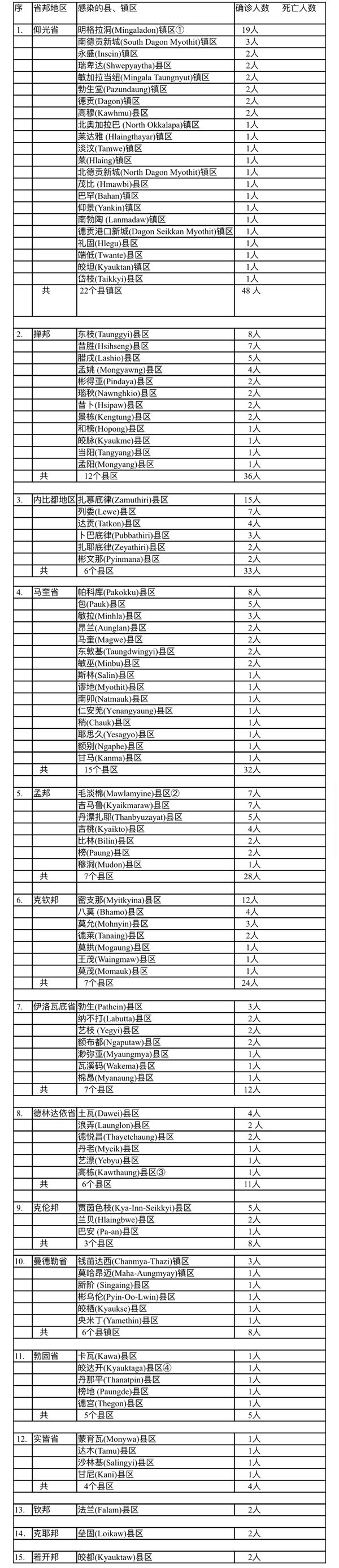 10月16日这一天缅甸全国确诊人数为255人,确诊人员来自全国15个省邦地区(没有任何省邦是零确诊地区了)。各省邦地区感染的县镇区及确诊人数如下表: