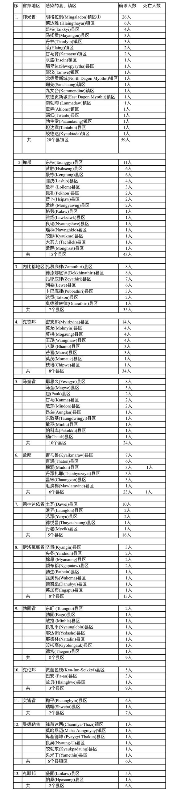 10月17日这一天缅甸全国确诊人数为284人,确诊人员来自全国13个省邦地区(仅有钦邦及若开邦是零确诊地区)。各省邦地区感染的县镇区及确诊人数如下表: