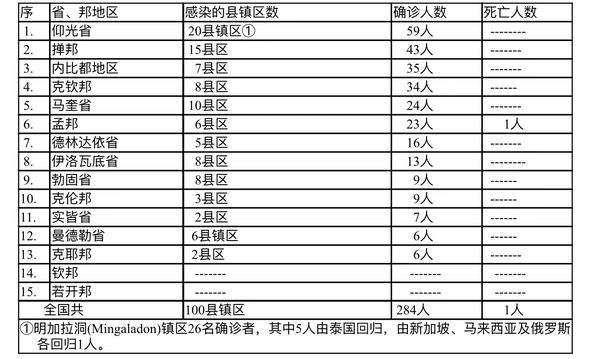确诊者284人,来自13个省邦地区的100个县镇区,另有1人因新冠疫情而死亡,那是来自孟邦穆洞县区的1名民众。确诊者中由国外回归者为8人(5人由泰国回归,由新加坡、马来西亚及俄罗斯各回归1人)。国内确诊者276人,仰光省占51人(约为18%的比例)。各省邦的确诊人员约为仰光省确诊人数的4.5倍。各省邦国内确诊人员225人中, 掸邦43人,内比都35人,克钦邦34人,马奎省24人,孟邦23人,德林达依省16人,伊洛瓦底省13人,勃固省及克伦邦各9人,实皆省7人,曼德勒省及克耶邦各为6人。全国各省邦确诊人数此起彼伏,变化不定。其中克钦邦首府密支那县区单日确诊者14人,是除仰光省之外该日全国各县区中确诊人数最多的一个县。另外掸邦首府东枝县区单日确诊者11人,德林达依省首府土瓦县区确诊者10人,都是不容忽视的疫情较为严重的地区了。
