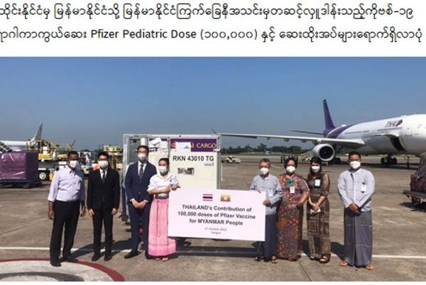 为了援助缅甸新冠肺炎防控治疗工作,泰国通过缅甸红十字会捐赠了可供儿童注射的辉瑞疫苗(Pfizer-BioNTech)10万剂以及注射器,于10月21日上午抵达仰光国际机场。