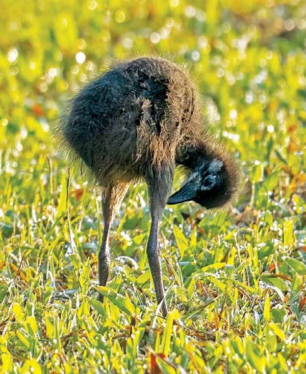 鷭鸟身体为黑灰色,红喙,体长14英寸(约合35公分),在水边及沼泽地觅食,有时也会飞到树枝上栖息。每年的5月至7月间是其产卵及育仔的季节,是在雨季时期进行繁衍工作的飞禽鸟类。