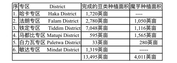 本年度内钦邦个专区内完成的各种豆类与魔芋的种植面积如下表: