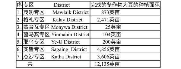在2022—23财政年度冬作物种植季节中,实皆省内的7个专区已完成了大豆这一作物的12,135英亩的种植工作。
