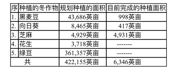 另外规划种植4,929英亩的芝麻作物,目前已在岱枝县区内完成了4,931英亩的种植工作,超额完成了原规划的种植面积。另外规划种植3,718英亩的花生,361,357英亩的绿豆,这些作物都将在皎坦、宋割等县区内种植。