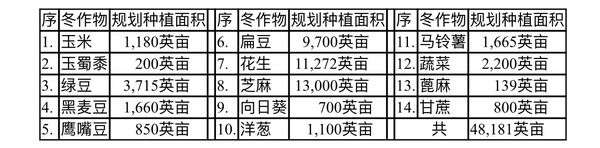 达贡县区在今年冬作物种植季节中规划种植玉米、各种豆类、油料作物、厨房作物等共48,181英亩。各种作物种植面积如下表: