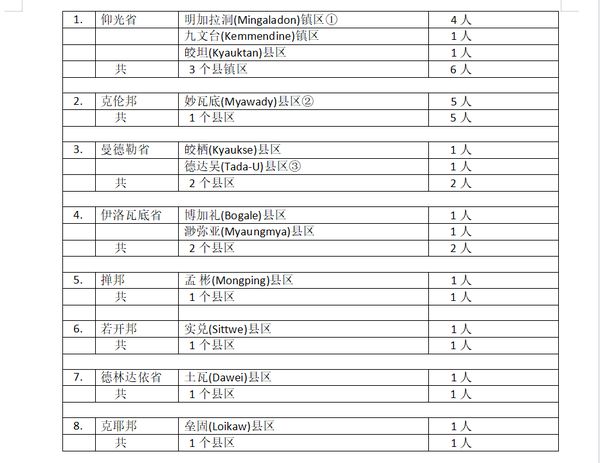 11月26日这一天缅甸全国确诊人数20人,确诊人员来自全国8个省邦地区(实皆省、勃固省、马奎省、内比都地区、克钦邦、孟邦及钦邦这7个省邦地区为零确诊地区)。各省邦地区感染的县镇区及确诊人数如下表: